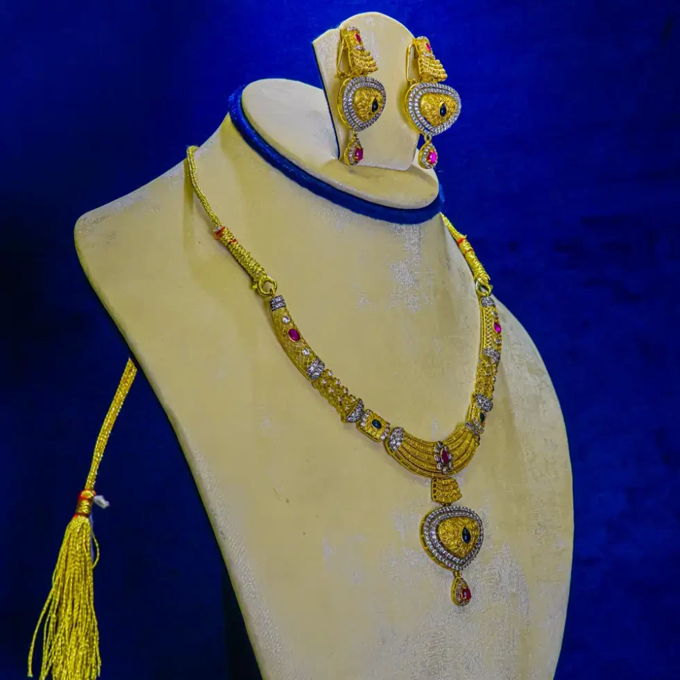 Handcrafted in 21K gold, our Bridal Necklace Set is a stunning fusion of traditional artistry and modern sophistication. Designed for brides who seek a radiant and unforgettable presence, this necklace set features exquisite detailing, exceptional shine, and timeless charm. Whether worn as a statement piece or paired with matching bridal jewellery, it brings unparalleled grace and grandeur to your wedding look — where elegance meets everlasting beauty.