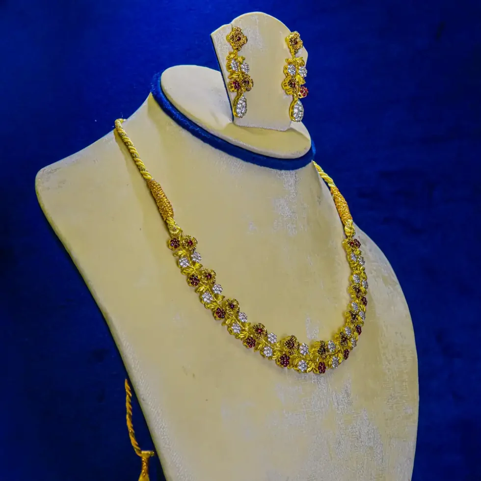Handcrafted in 21K gold, our Bridal Necklace Set is a stunning fusion of traditional artistry and modern sophistication. Designed for brides who seek a radiant and unforgettable presence, this necklace set features exquisite detailing, exceptional shine, and timeless charm. Whether worn as a statement piece or paired with matching bridal jewellery, it brings unparalleled grace and grandeur to your wedding look — where elegance meets everlasting beauty.