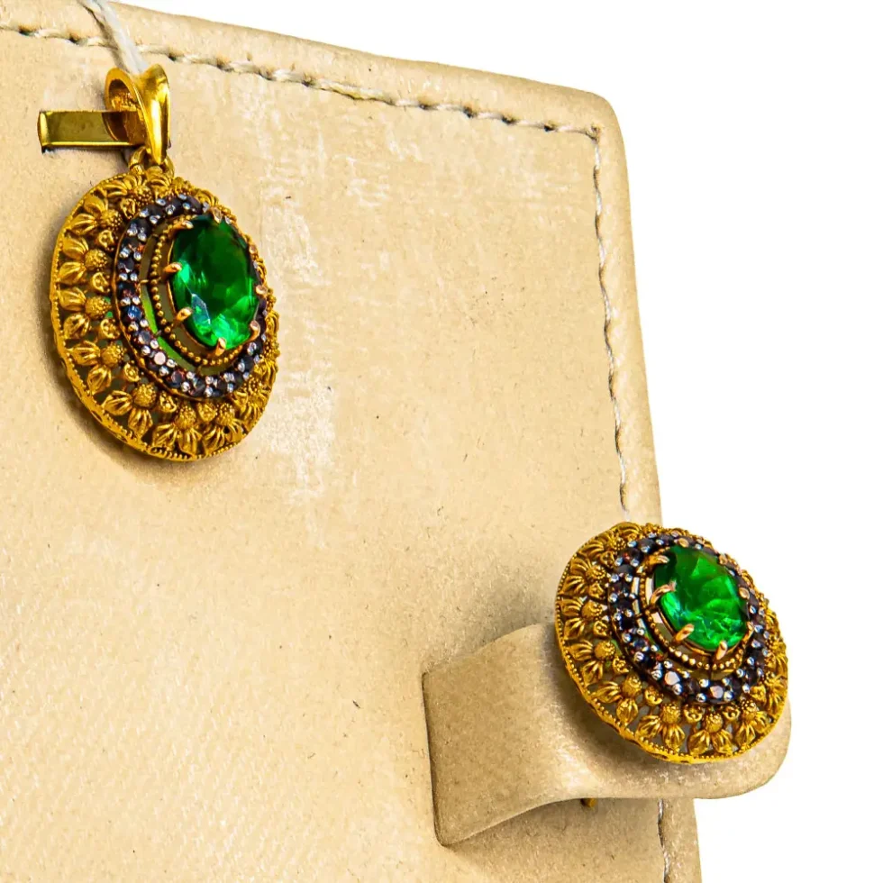 Radiate timeless charm with the Emerald Pendant Set, beautifully crafted in 21K gold. Featuring a striking green emerald stone surrounded by intricate gold detailing, this pendant set adds a touch of royalty to any look. Paired with matching earrings, it’s an exquisite choice for both formal occasions and graceful everyday wear.