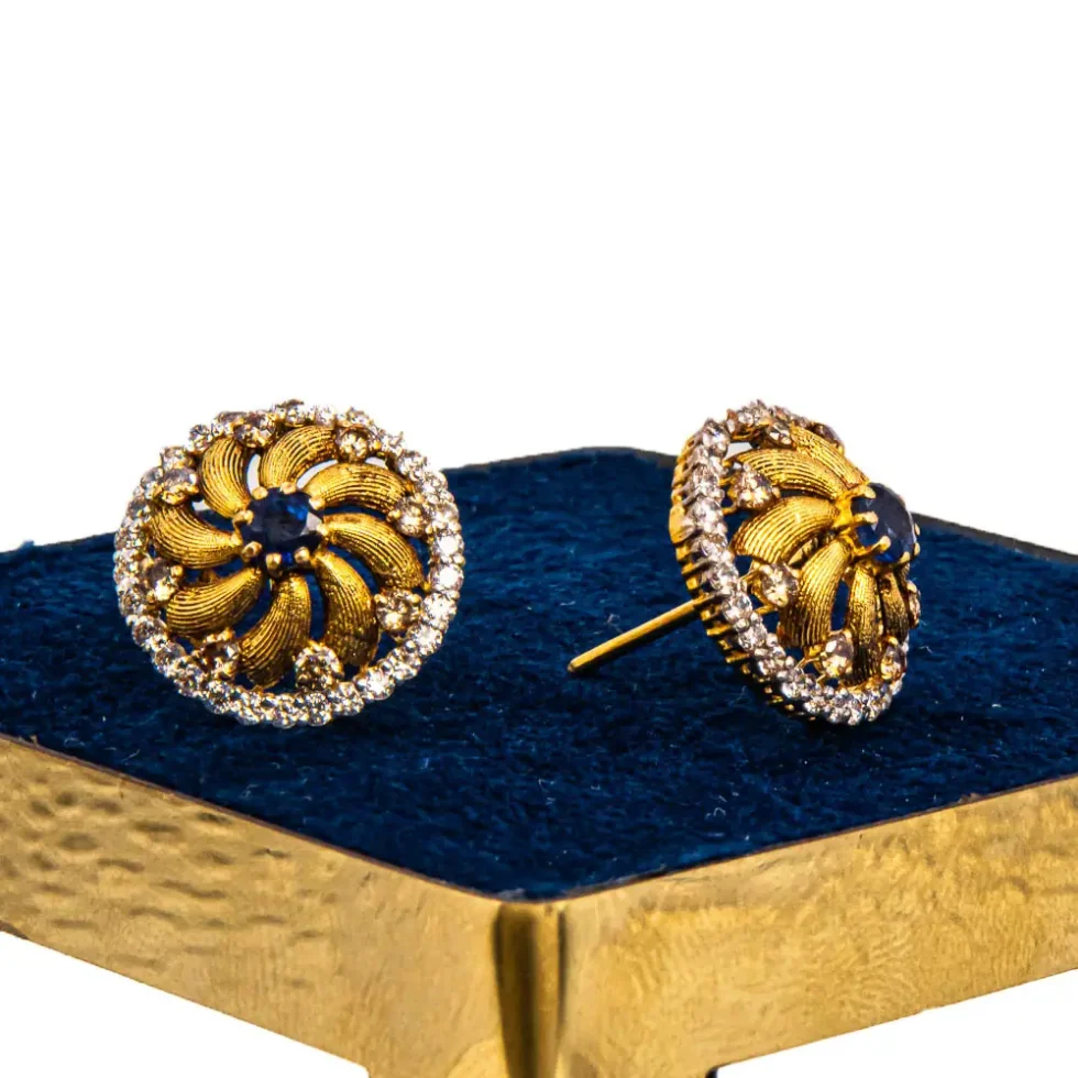 Crafted in pure 21K gold, these Golden Petal Gold Tops feature a delicate floral design accentuated with sparkling stone. Their elegant petal shape radiates timeless beauty, making them ideal for festive occasions or graceful everyday wear. A perfect combination of traditional artistry and modern refinement.