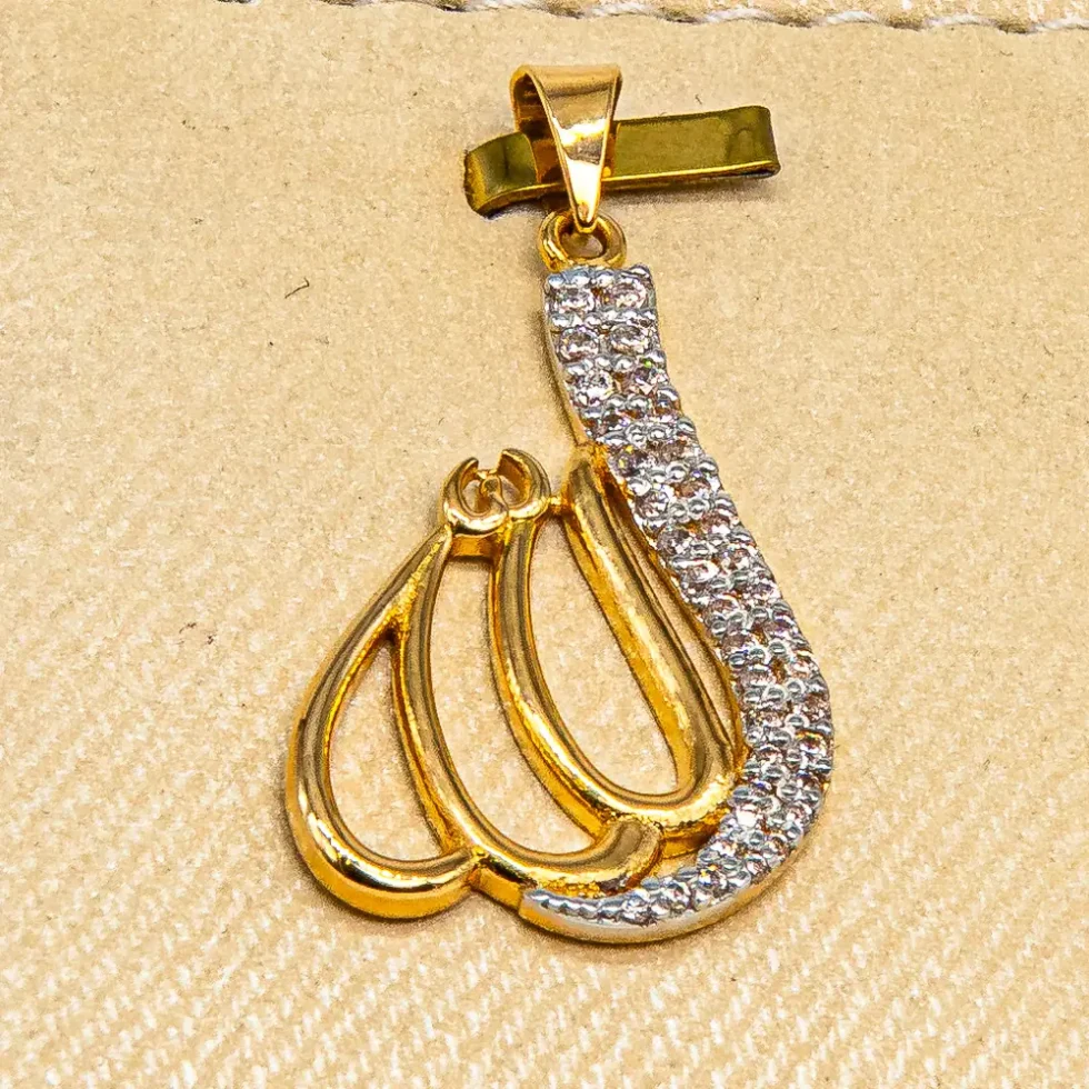 Beautifully crafted in pure 21K gold, the Islamic Calligraphy Pendant features the sacred name of Allah, symbolizing faith, devotion, and timeless elegance. Its intricate design and antique gold finish make it a meaningful addition to any jewelry collection — perfect for daily wear or special occasions.