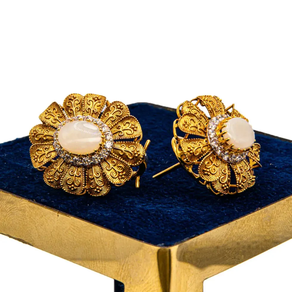 Beautifully crafted in 21K gold, these floral-inspired tops feature a luminous white pearl center surrounded by fine detailing. Their soft, elegant charm makes them a perfect choice for weddings or classic everyday style.