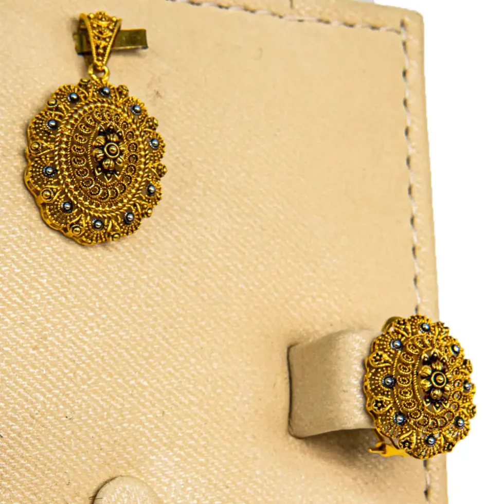 Elegant and timeless, this Plain Gold Pendant Set is crafted from pure 21K gold with a sleek, polished finish. Its minimal yet luxurious design makes it a perfect choice for both everyday wear and special occasions — a true reflection of refined simplicity.