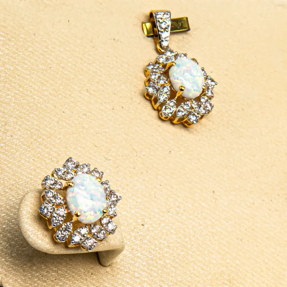 Radiating pure sophistication, the Real Opal Pendant Set is crafted from 21K gold and features a stunning natural opal that shimmers with a play of soft colors. Surrounded by delicate gold detailing, this set beautifully captures light and elegance. Perfect for graceful evenings and timeless everyday wear.