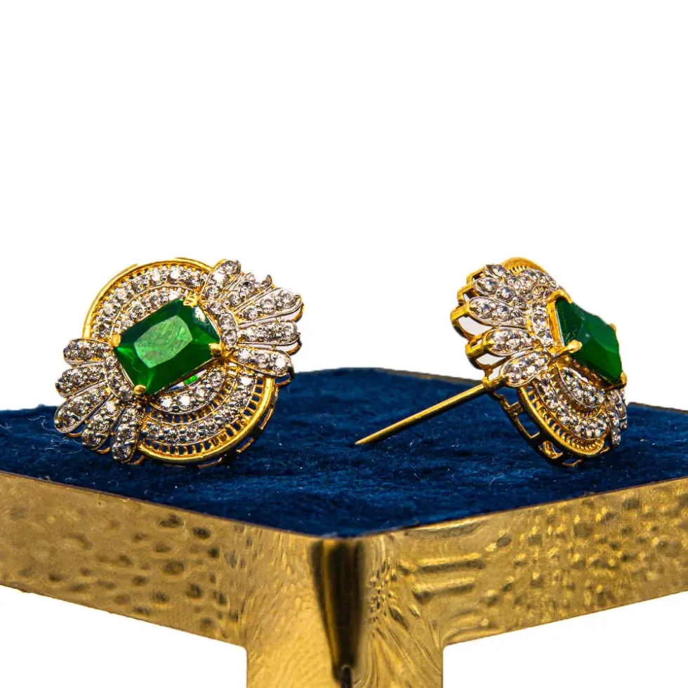 Crafted in 21K gold, these tops showcase a royal green round stone encircled with dazzling diamond accents. A perfect blend of tradition and luxury for every occasion.